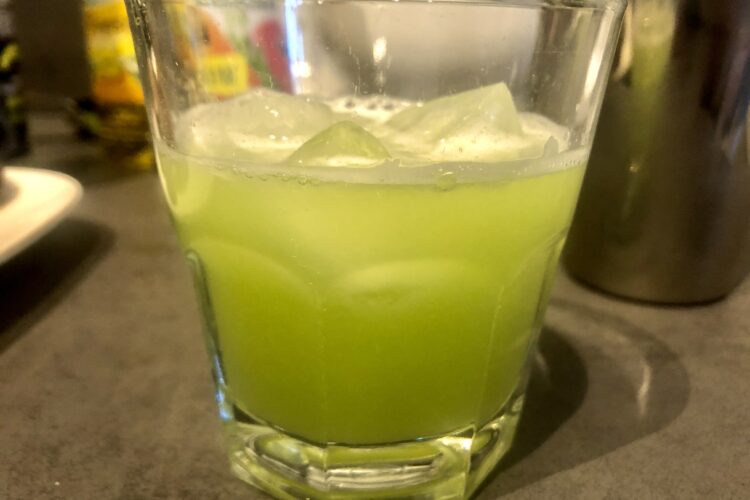 - Zitrone mit Zucchini crashen, Rest dazu, mit Eis shaken, abseihen